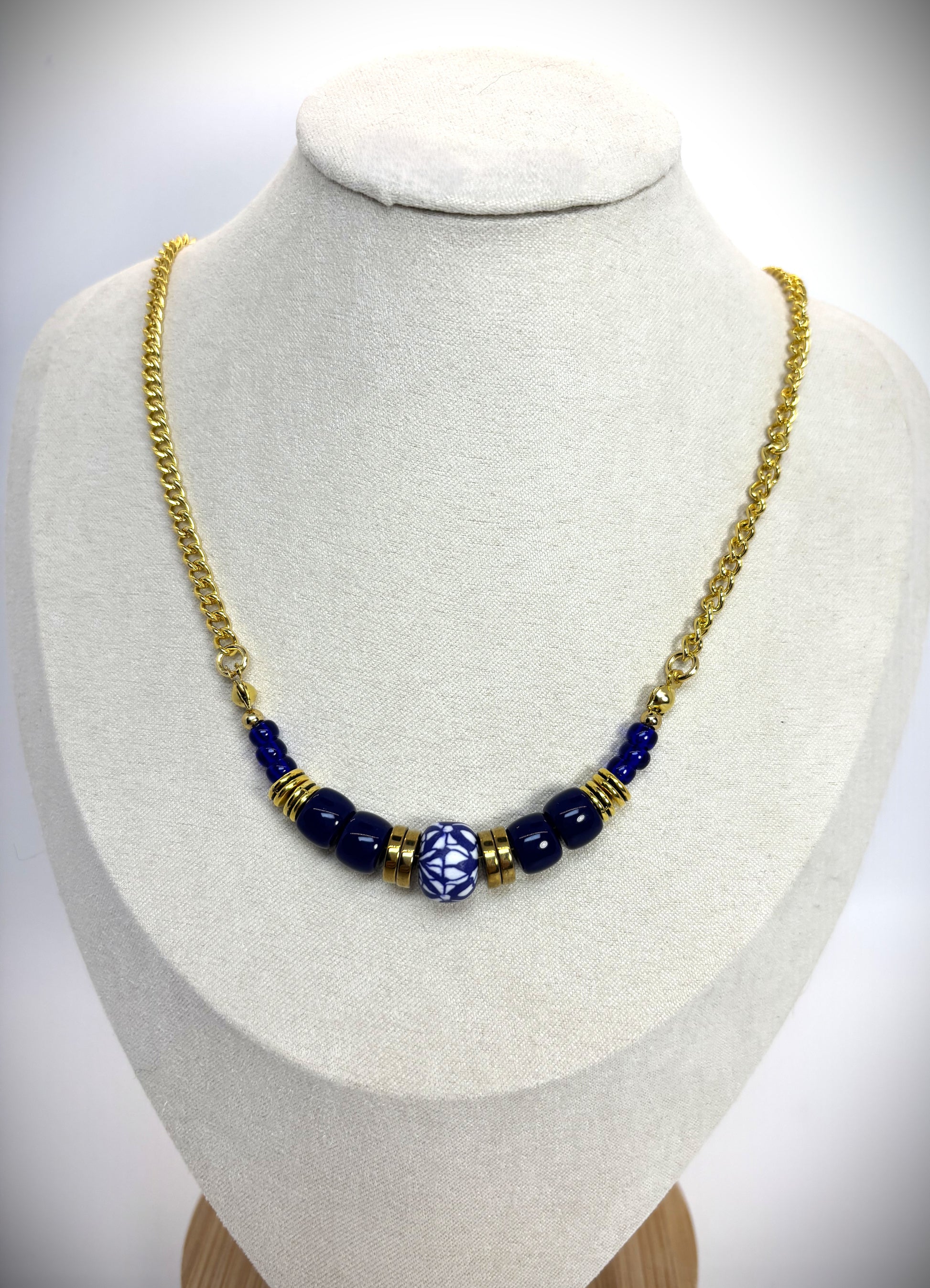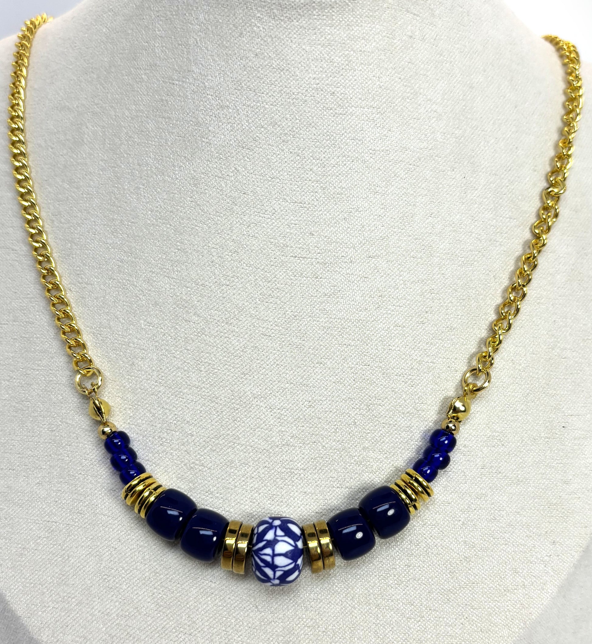NE-0076 Navy & White Abstract Necklace on Gold-Plated Chain